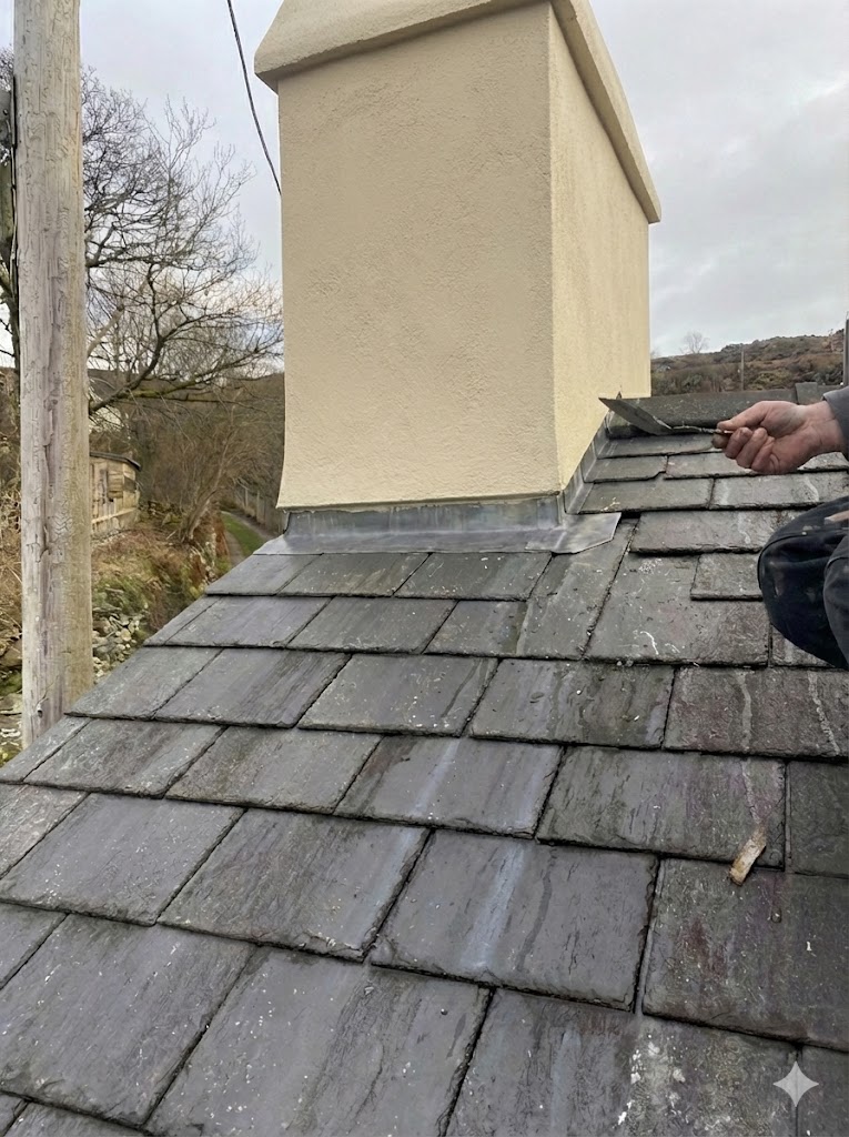 We specilise in Chimney stack renovations.The recent chimney stack renovation in Blaenau Ffestiniog.We rendered the stack also paited using acrylic paint.Also we repaired the Welsh slate roof by installing all missing slates.Keeping the heritage and providing superior weather proofing.